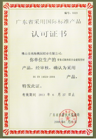 廣東省采用國際標準產品認可證書